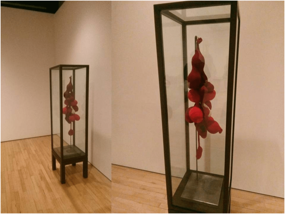 That is probably the case though any reader will want to add some dominant associations, such as the memory of meat hung for preparation, the shape and colour of a drop of blood or, on the other side, seminal fluid. But it remains true, as Rugoff concludes, that the ‘categorical fuzziness’ of the concepts evoked is ‘facilitated by’ the fabric construction’s ‘fuzzy surfaces’. Except, and Rugoff does not go here, intervening between viewer and object are different hard surfaces of glass and metallic mesh. These hard distance-creating elements also interact with meaning – for instance the side on which breasts may be indicate is seen through something like a cage’s mesh, whilst the small pink flaccid phallic shape is seen through transparent but still hard and framed glaze. And below the construction is the stain of its shadow on the floor of the cage, which is suspended on feet above the gallery floor but resembles conventional floor-boarding. These points merely amplify Rugoff of course. And supports too his view that Bourgeois late fabric art ‘seems to ask for a distanced gaze, as if we were being summoned to study not a work of art so much as its inner mechanisms’.[6] It rings true too with the way in which the complex coding of the art and the play within it of distance and proximity to our inner lives is, as Cooke says, in contrasting it to woven art preceding Bourgeois’ major intervention, which she saw as ‘delightful’ but as NOT making ‘exigent demands of the viewer as did a work of art’.[7]