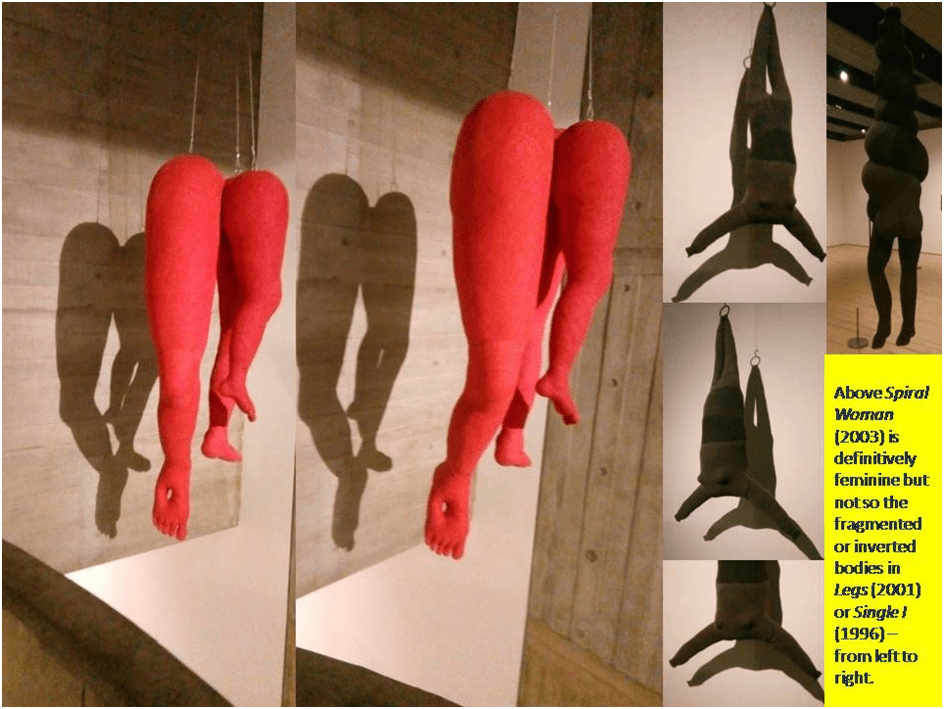 Sometimes the representations of the body are suspended from a hook in this show as parts or wholes. Sometimes their meaning seems simpler as in Spiral Woman (2003), which is definitively female in its coding as well as title, although mainly associatively, through curvaceous soft structure and body attitude (none of which are biologically determined entirely). However the suspended work Legs utilises its ‘third middle leg’ as a phallic substitute in part (remember that slightly distasteful Jake The Peg song by Rolf Harris) and one foot bears a stigmatum of a pierced foot. Both pieces facilitate use sculpting of their shadows in light to complicate their categorical identity (we see hearts, anuses and non-binary leg interweaving in Legs and can see Single I as a phallic symbol with the ‘breasts’ as gonads, especially given the child-like leg appearance of the ‘arms’ of the piece in shadow.