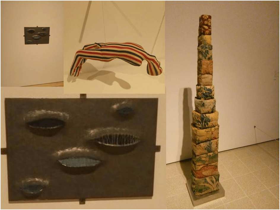 Sometimes an exhibition is in perfect harmony with its subject, which in this case is to be big, various and complexly organised enough to accommodate contradictory forms and concepts in one space without damping their effect as single works of art or works in interaction with each other. For Bourgeois herself the problems of space and volume were constitutive of sculptural experience and this may be what she means by saying earlier in her career that she found work with textile antipathetic not only to her art but all art. Lynne Cooke in an essay in the accompanying book to the exhibition cites the artist’s ‘forthright and direct’ opinion: “I have found the medium of weaving incompatible with the art of the sculptor”. Moreover, she further elaborated the cause of that incompatibility to be the absence in woven objects of the ‘”emptiness and the fullness which is essential to the space and volume of sculpture”.[2] I am not pretending however, as more professional and/or academic critics of art often do, that these terms of evaluation are self-explanatory or, strictly speaking, fully explicable except to the sensations they refer to. I understand them in terms of the ways sculptor fills space but only by insisting on a degree of empty space to stand between us and it and perhaps from our penetration of its interiors.