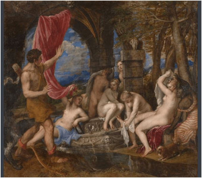 Whitey’s inexplicable suicide opens the problem and remains the problem whose solution is hunted for in the novel and never found, though those metaphors of hunting, seeking and finding resonate symphonically throughout the novel.[20] What you seek is not always, perhaps never what you find in the brightness of day only in the ‘dark imagination’ of a movie theatre or, and the suggestion is hidden in the following extract, the fate of Actaeon capturing sight of the true beauty (Diana) he desired but MUST not know – in my certain view that is the prohibited pleasure of Whitey’s beauty.
