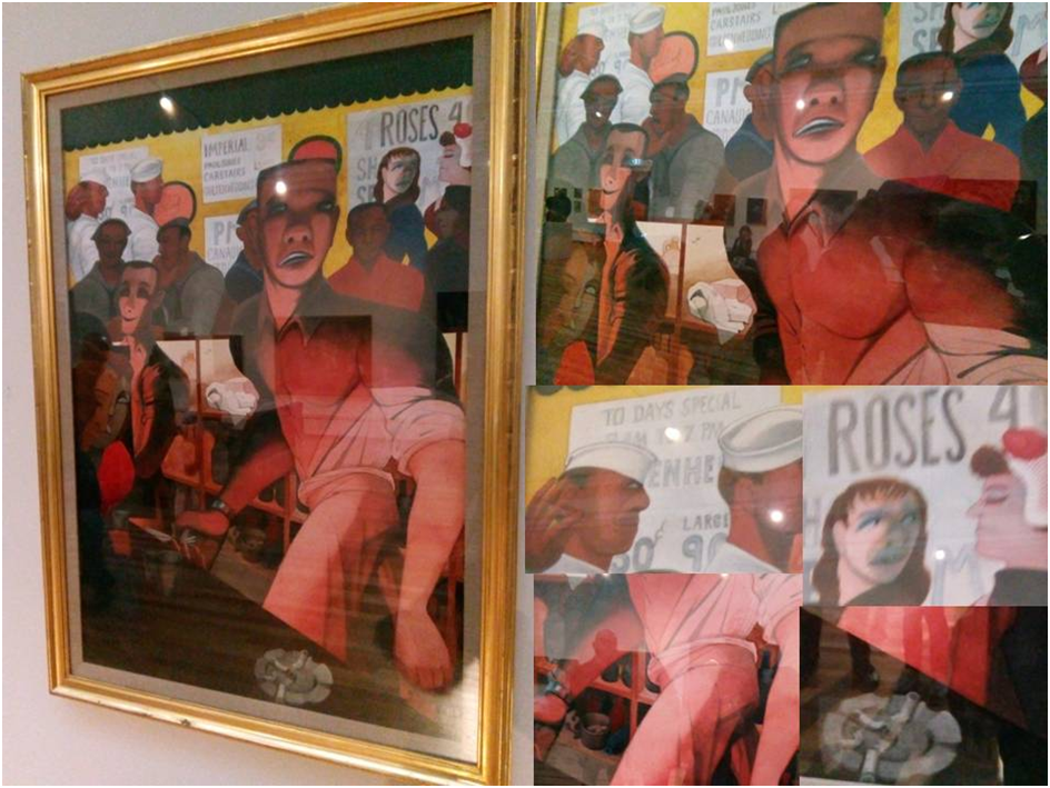 But for me, the main delight was the queering of the Burton display gallery itself, which is approached via a dark Edwardian style staircase lined with the more conventional William Etty portraits. The first delight was the presence of artworks I knew to be present in the York archive but which were rarely shown, such The Silver Dollar Bar, painted in about 1953, showing a bar in Harlem where queer and black culture thrived and of which Burra knew, mixed as it was with his perennial fascination with the life of international sailors and the easy sex with which they were rightly or wrongly associated. I have wanted to see this painting whilst working on Edward Burra in an unfinished MA in Art History, one piece of which had also concentrated on a Harlem night-life interior scene.