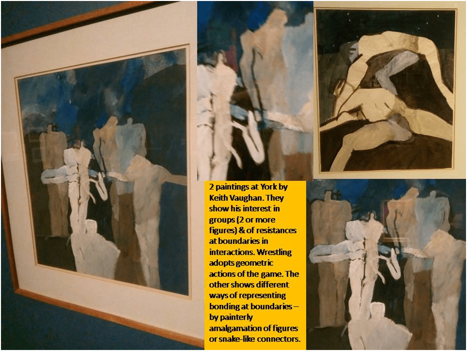 Likewise I saw in the Queered Burton Gallery At York paintings by Keith Vaughan I did not know though I had formed an interest (as shown in this blog) and on whom I had determined to base my abandoned (there are reasons why I distrust institutions however ‘open’ they claim to be) MA dissertation (my draft plan in the blog at this link). These paintings fuelled my intellectual interests again about how queer personal interactions and groupings became a focus in post-war Britain , Vaughan’s paintings showing deep attention to how and why the idea of ‘assembly’ was charged for queer people by the marginalisation of their groupings. Such groups often show connectivity that he represents by the avoidance of lines and the liminal effect of coloured patches of paint that blur into each other. At other times, following his Laocoön series of paintings, he shows connectors between bodies which look like snake-like creatures. Hard lines bounding a figure may show where groups of marginalised people disintegrate, under oppressive surveillance or interference, into individuals in isolation. Here is a collage of the two paintings (I neglected to take the names and details):
