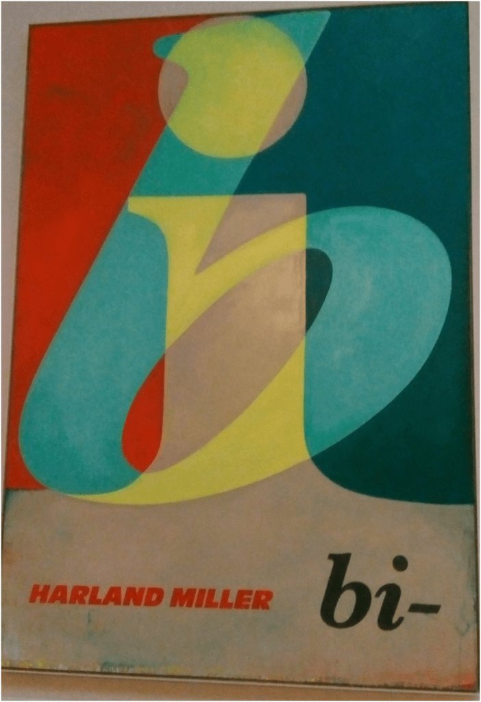 Vaughan’s paintings speak to members of the LGBTQ+ community in ways I don’t see in other painters even where the figuration is more realistic or intended to show figures that have become objects of desire as in John Minton’s paintings. These then speak to me about and at the level of my thoughts and feelings about queer communities. Other paintings cover the diversities of our communities – over sex/gender boundaries too. Indeed Vaughan claimed to be doing that but he doesn’t always convince that his figures are not intended to represent interactions only between men. I hesitate to examine the lesbian art figures because of fear of colonisation of them, though I do not feel that about Harland Miller’s Bi, which both posits the idea of a binary biological sexual division implied in the term ‘bisexual’ but in fact makes us celebrate a much wider than binary diversity in the meaning of that word in his painting because of the play of multiple colours within it that also trouble the calligraphy of the word into a more celebratory multiplicity.