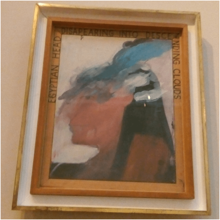 That there is an early Hockney is tremendous and needs a showing. Indeed its use of painterly blurring of lines (to be expected in a painting called Egyptian Head Disappearing Into Descending Clouds, written across the inner frame of the picture in fragmented sentence using a kind of calligraphic printed writing) reminds me somewhat of Vaughan’ mergence of figure and background for thematic purpose. It suggests something about the coded nature of queer desire in the period of its painting: