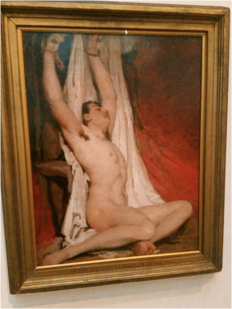 However, the York community has long expressed its fascination with the queerness in every which way, that cannot have been totally consciously intended, in Sir William Etty’s most famous male nude. He collected guardsmen from the barracks it is believed to take to his studio to paint in classical poses. These were intended in part as ‘life studies’ usually done by younger painters, but which he continued to make throughout his life. It is for this reason that Etty justified the tying up of this nude. There is a fascinated desire in the demonstration of potential pain, despair and powerful subjection to the gaze of his nude young men that is just missing from his fleshy female nudes – something I noticed when I first saw this painting in the Flesh exhibition on York Gallery’s re-opening in 2017 (but did not include in my brief blog – see this link).