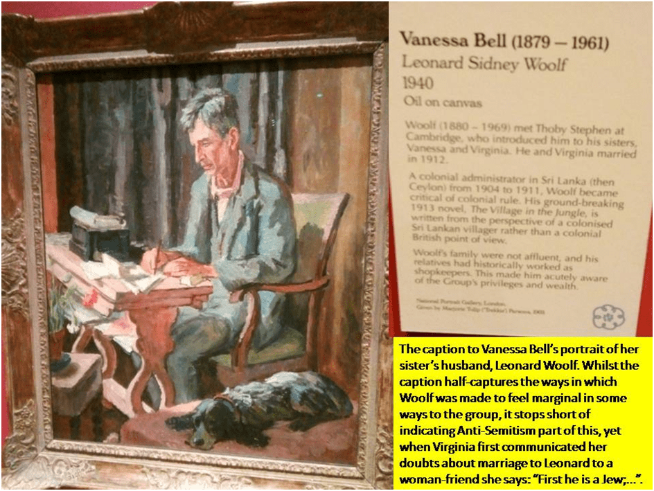 The artists involved treat work from Bloomsbury critically and not just reverently by holding against it important perspectives missed by the Group itself, which shared the widespread oppressive attitudes of the period. Not all those points are as stressed as they might be. For instance, Leonard Woolf was from a background far less privileged than the rest of the Group, including his wife, Virginia Woolf. This led to a kind marginalisation of him and this is a point not lost in the caption commentary of Vanessa Bell’s portrait of him. However Leonard was also Jewish. Whilst the caption captures one way in which Woolf was made to feel marginal in to the group, it stops short of indicating the Anti-Semitism he experienced in the manner and tone of the others. For instance, when Virginia first communicated her doubts about marriage to Leonard Woolf to a woman-friend she says: “First he is a Jew; …”.[1]
