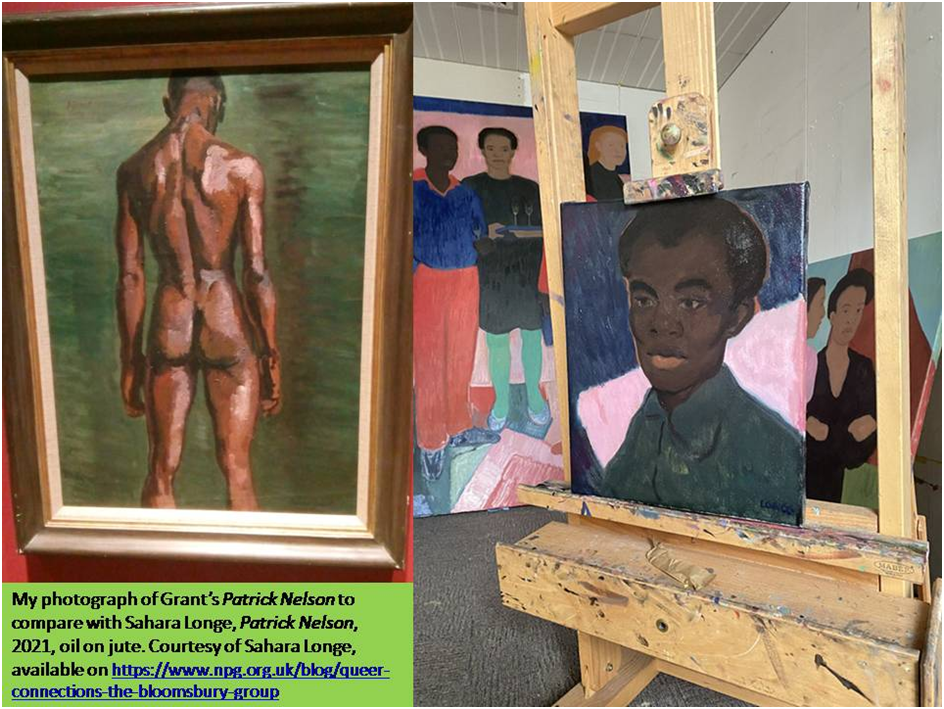 In a section on Duncan Grant and his circle, a new portrait of Patrick Nelson (1916 – 1963) by Sahara Longe (born 1994) is paired with a nude depiction of the same sitter by Duncan Grant. Both of these works offer an insight into Grant and Nelson’s loving relationship, whilst highlighting the prevalence of exoticism. This form of racist stereotyping involves the fetishisation of black subjects by white artists. Grant’s nude poses questions about the nature of his attraction and how this is expressed in the way in which he painted Nelson. Longe’s sensitive portrayal of Nelson gives him agency beyond this relationship.[2]
