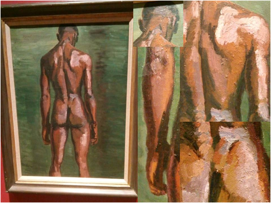 Another contingency related to community work in innovative galleries is the use of practising artists to appreciate, critique and work with aesthetically the influence of this powerful art. Power can imply harm as well as beneficence and I have spoken about different ways of distributing and humanising this power in my first York blog and will not repeat this here, although this feature transforms the very look, feel and meanings of some of the paintings, especially around the notion of intersectional identity. However, it is important that we confront the meaning of the racism perceived in the art of this period, especially in relation to queer sexuality, where heavily hypersexualised images of black men were common, but not only amongst queer white men. It is in this light, as well as that cast by comparative images from artists of today, that we should look at Duncan Grant’s relationship with Patrick Nelson, the subject of nude and clothed portraits by Grant (though only a nude portrait in dorsal view (seen from the back) is available in this exhibition). Below is a collage of that painting of him with selected details, which latter I have deliberately organised to emphasise the fragmentation of these parts from the whole as an aid to seeing specific sense effects (haptic as well as visual) in relation to certain body parts of the black male nude.