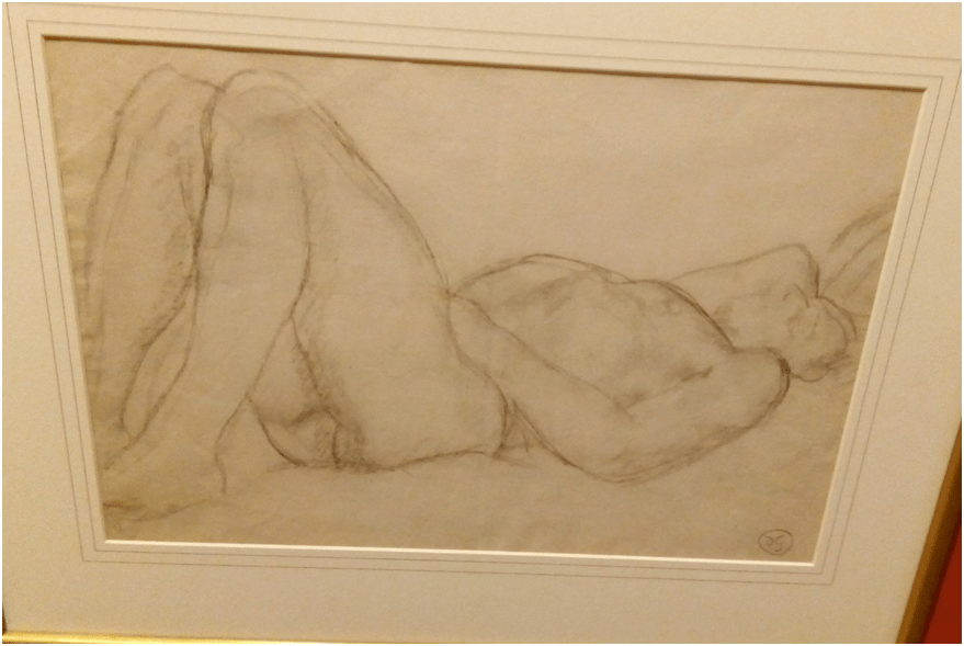 Meanwhile, ‘Longe’s sensitive portrayal of Nelson gives him agency beyond this relationship’. Personally, I think this may be a problematic statement that over-simplifies, in the grandiose manner of academic art-history and art-theory that is divorced from awareness of human praxis, the relationship between gender/sex, race, identity and the means by which images are valorised in sexual ways. The same happens in treatments of John Singer Sargent’s relation to his black model, Thomas McKeller, according to Colm Tóibín and I have examined this essay in a previous blog (available at this link). For the only thing that makes this portrait hypersexual would be the fact that the model is nude. But this is no more nor less sexual than the paintings of, for instance Paul Roche, the man who became Grant’s last personal assistant and, at least until his heterosexual marriage but perhaps afterwards, Grant’s lover in a physical as well as in other ways. For instance, we can see that in comparing the reclining nude drawing of Paul Roche and Patrick in this exhibition, it is Paul who is presented as sexually inviting to the gaze of the viewer, whilst Patrick’s dorsal nude emphasises the vulnerability (noted in the York caption) in my eyes more than sexual allure to a specifically white male gaze; and certainly not a lack of agency as Longe suggests.