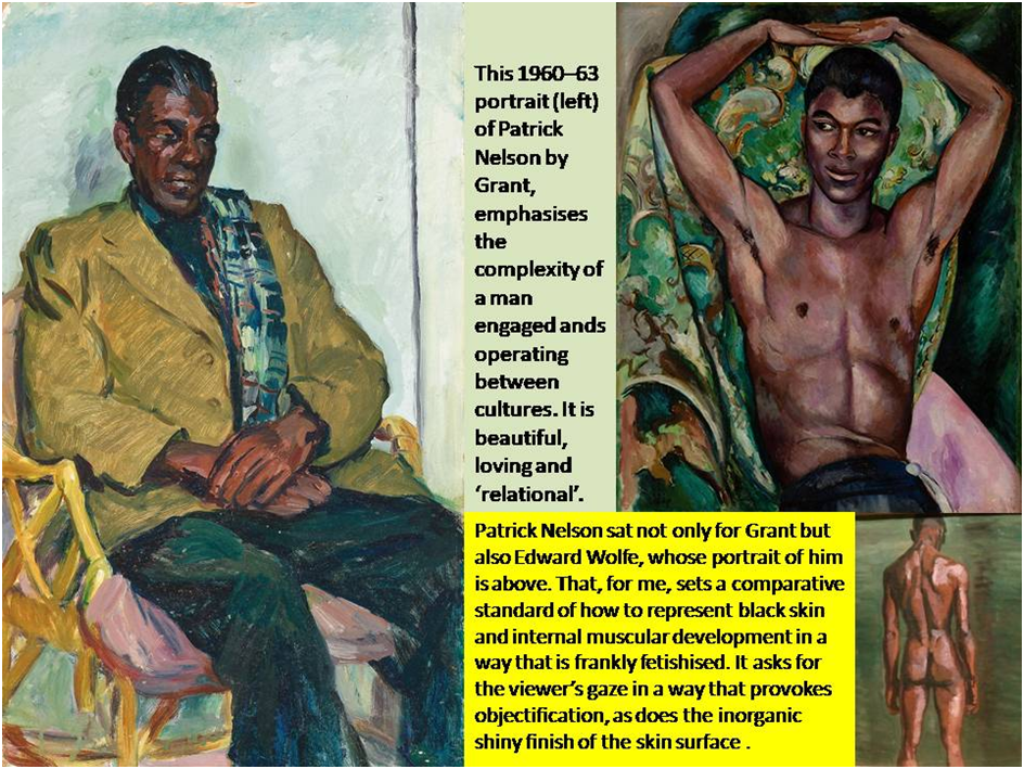 However recognising the hypersexual is not always easy and distinguishing it from the haptic appreciation of the naked body, black or white, almost impossible. In comparing Sahara Longe’s clothed frontal portrait of Patrick Nelson with Grant’s, as they appear in this exhibition, the NPG commentary sees a particular kind of ‘racist stereotyping’, which ‘involves the fetishisation of black subjects by white artists’. This is emphasised at the cost of other readings in the otherwise useful York caption.
