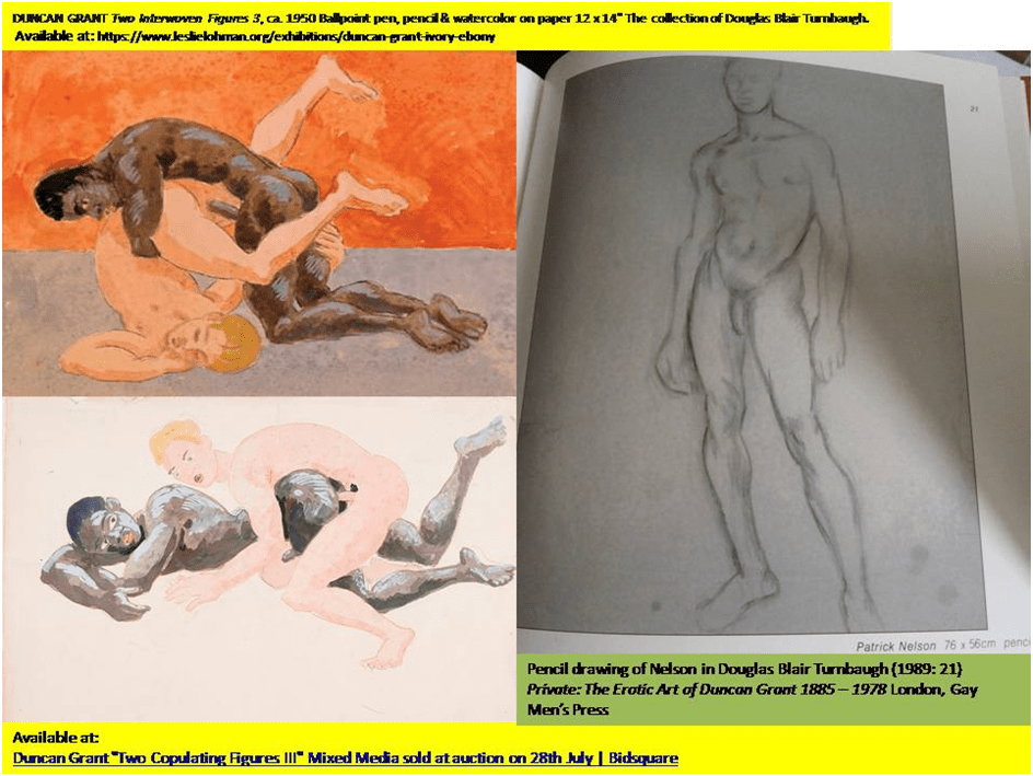 However, since I am not a black queer male I may be not entitled to judge such matters. Nevertheless it seems a travesty to me to see Grant as incapable of finding something in Nelson as he appears in Grant’s public painting as a figure that is the mutual equal of himself and not necessarily apprehended by him as an inferior, although the same may not be precisely true of Singer Sargent given the differences in life experiences (I do not know). Likewise unlike the more caricatured erotica here, I do not in the portrait nudes see negative different typed into racial difference. Frances Spalding gives little detail about Patrick in her biography of Grant but she does cite a letter to Grant written by Nelson when, parted because Grant was at Charleston and Nelson pursuing a relationship, where marriage was an option, with someone known to us only as ‘girl called Olive’. In this letter there is much of a both an interior Patrick Nelson, whose analysis and feelings are spoken as if they were expected to be recognised and acknowledged by Grant as that of another like himself and not as someone ‘othered’: