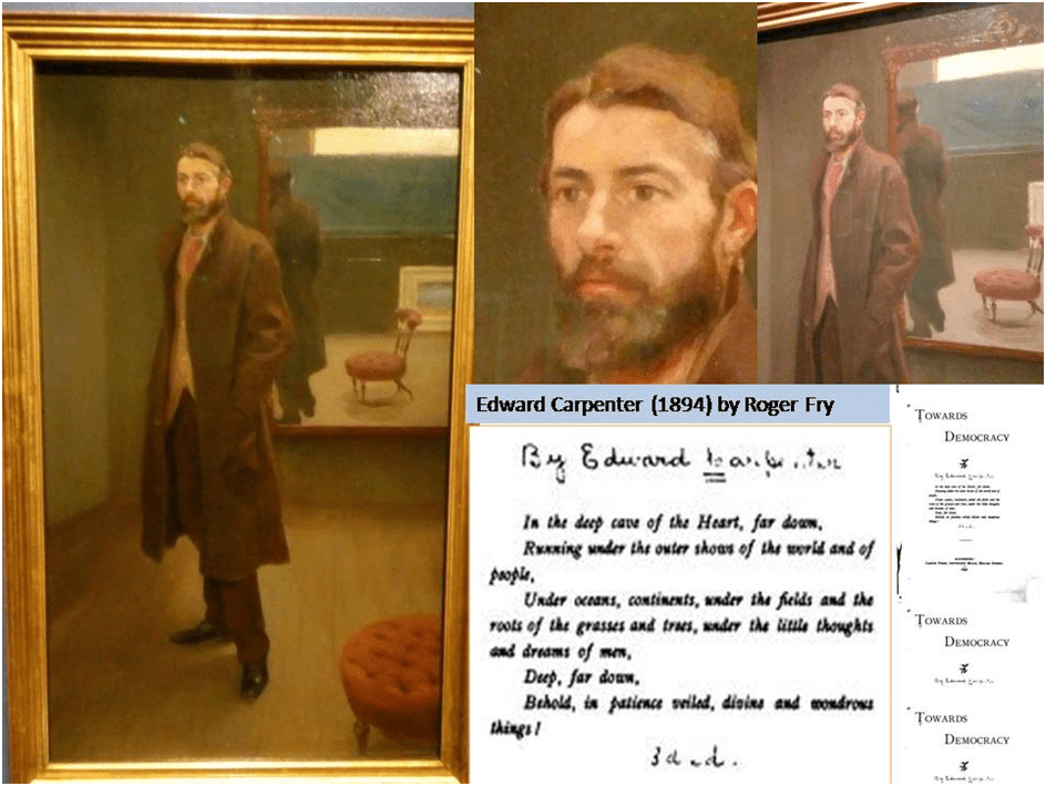 This is as abstruse as I have previously been in trying the capture the meaning of ‘inward excursions’, but it possibly does show how Carpenter related truth to ‘self’ as a political and spiritual and liberationist commitment (these things, given that deity is not invoked, are equivalents in Carpenter’s thought) which aim to free the person to relate outside the restrictions of a current oppressive social structure and its politics: to ‘turn the lock easily and loose your chains’. If we think laterally we shall see picture evidence of this in this exhibition, because it contains Roger Fry’s portrait of Edward Carpenter (1894), painted one year after the first publication of Towards Democracy. I have collaged my photograph of this painting with a picture of the poems as they appeared in the USA edition.