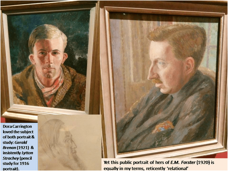 In fact, this duality is the key to the power of most of the Bloomsbury portraits I saw in this exhibition. In, for instance, those portraits represented here by Dora Carrington of her lovers but also of those public figures she knew as absorbed in matters located in the ‘deep Cave of the Heart’ such as E.M. Forster. The latter was a friend of Fry and Carpenter, and equally certain that liberalisation of the possibilities of romantic and sexual relationships were radical necessities of social change in terms the governance of social relationships, including class, status and the constitution of the human. In the exhibition Carrington’s 1916 portrait of Lytton Strachey is represented only by the studies also owned by the NPG. However, this alone shows her aim to see this man, not immediately attractive, as a force in the forging of aspiration for the new and ‘seemingly’ impossible. Spalding cites her comment to a later aspirant to her love, Gerald Brenan, that: “I would like to paint like Ucello and I never shall … it has something – this desire – to do with my wish to have Lytton as a lover, a wish which the verriest goose could have know impossible”.[7]