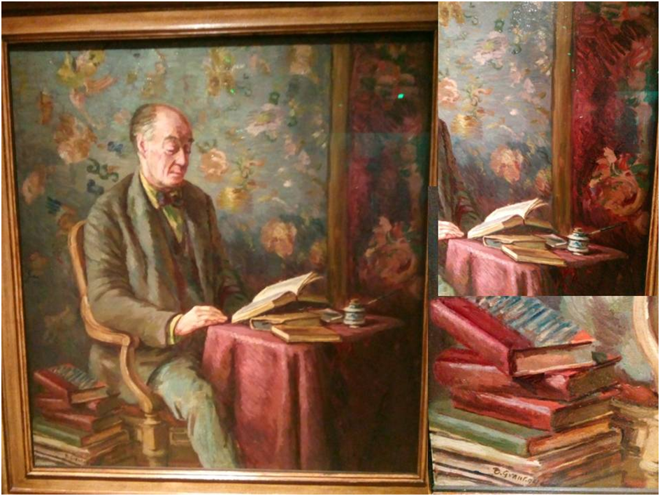 I used to think that Spalding’s characterisation of Duncan Grant’s 1994 portrait of Desmond MacCarthy was aimed at the same theme as I pursue here but rather in the spirit of how you paint a man who has resigned the outer show of inner life and love. She says that he is contained ‘by the outline the chair and cut off from the spectator by the act of reading’ but I now think that description will not do if aimed to show that Grant was only interested in showing an ‘affable, reserved individual’. I do still believe that MacCarthy’s belief in the “spirit of dignified selection, what we call reserve” which “alone makes companionship, yes love, possible” is targeted in this painting but not at the expense of confirming that man’s belief in the inner life as a characterisation of the man Grant knew.[8] This painting is after all set in Charleston and Grant makes the star of it the décor and painted objects of that magical interior.