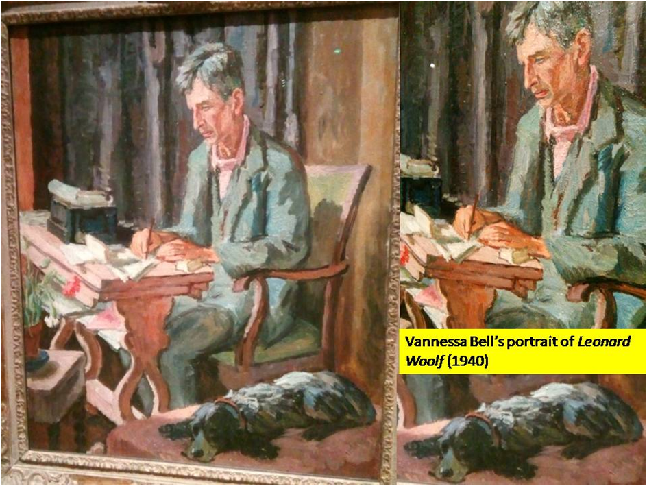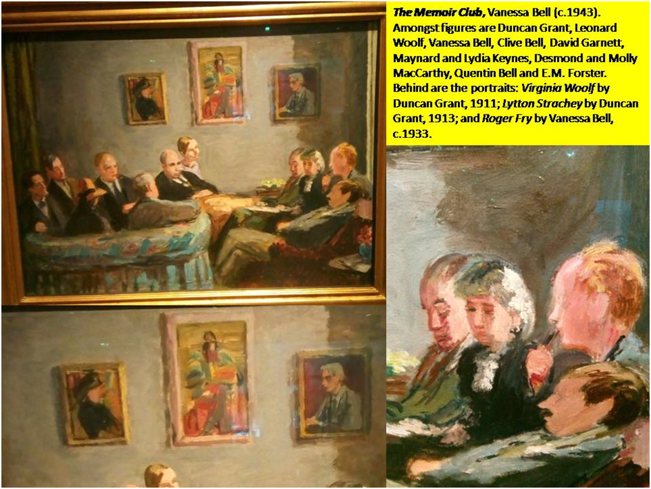 And this of the importance of relationship is at its most poignant in the ways that even paintings uses notions of anachronism in time and the role of memory and anticipation. A favoured painting in this collection is The Memoir Club painted in 1943 and containing a group representation of Bloomsbury Group members assembled in Charleston, the home of Grant and Bell. In my collage below below I have summarised information about the figures there represented from the appropriate NPG webpage. However, I have omitted the following about the significance of the gathering for those who may wish to fix on the actual date at which the group depicted sat together. Here it is (after the collage of the painting itself):