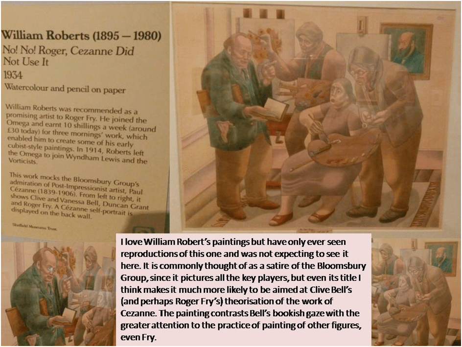One painting that is, somewhat at a tangent, that is also related to concepts of the Bloomsbury group as an identity like unto that of one being is William Roberts’ No! No! Roger, Cezanne Did Not Use It. I love William Robert’s paintings but have only ever seen reproductions in books of this one and was not expecting to see it here (or to see its small size since I expected a huge painting). It is commonly thought of as a satire of the Bloomsbury Group, since it pictures all the key players, but even its title I think makes it much more likely to be aimed at Clive Bell’s bossy theorisation of the work of Cezanne as the model of Bloomsbury’s art. The painting contrasts Bell’s bookish gaze with the greater attention to the practice of painting of other figures, even Fry, if we include his contrasted direction of gaze to that of Bell.