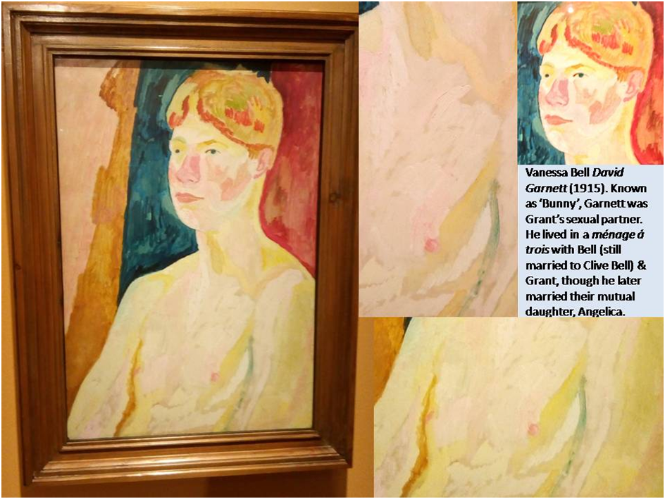 The messaging is clear. Both men act, not like men, but little boys and this is the state of the man in the portrait; unable to handle the emotion that is projected upon to him in many colours. His confusion is good to look at but rather a confused front to the adult passion of Vanessa’s flowing adult rich emotion. In fact she told Bunny at the time that she and the Bear, ‘decided we liked looking at you and after all what more can one say of anyone’?[17] This playful attitude to male bodies from a woman is the stuff of the queer lives in Bloomsbury: it speaks of embarrassing unequal crushes and queer fetishisations of the flesh or body parts, such as those insistent nipples of Bunny’s. It isn’t at all a ‘normal’ portrait of a man but a truer one of relationships, something which Bunny, as the adult novelist of Aspects of Love dealt with brutal honesty of his own self-suspected paedophilia, within a messy muddle of other relationships