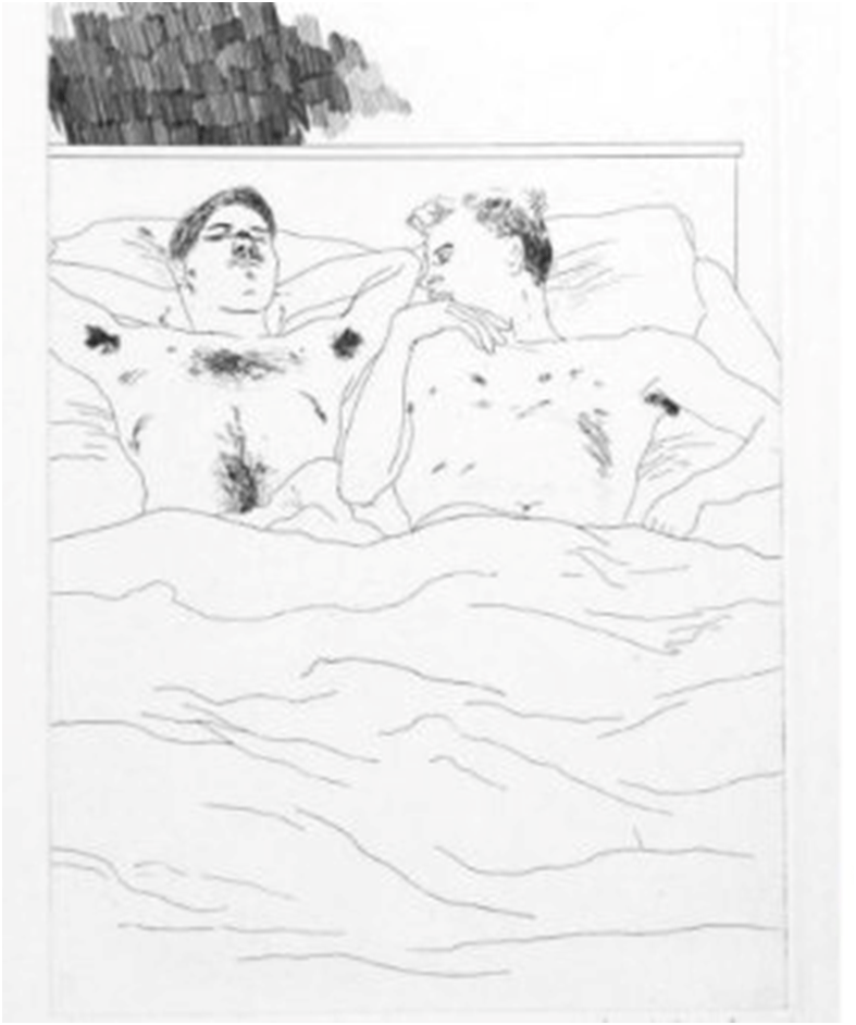 The themes here run variously through the first two substantial chapters of the book, with the first by Helen Little concentrating on the history of the Tate and its relationship to Hockney as indicative of themes 1, 3 and 4 particularly, but touching on the second in relation to the poetic work of Cavafy as an influence being used by Hockney ‘to draw attention to the British government’s controversial anti-gay Clause 28, which proposed to ban local authorities from promoting homosexuality’.[3] The beauty of the book however is that drier, if necessary, treatment of the relation of art to sexual and cultural politics is supported by one of the most beautiful short pieces. In the latter a major contemporary queer poet links his receipt from an early boyfriend of a copy of Cavafy’s poems to gift him at a Christmas home visit in Barnsley to Hockney’s past in Bradford and the latter’s etchings, which suddenly seem to be ‘devoid of wider context’ and to ‘luxuriate in their moment’.