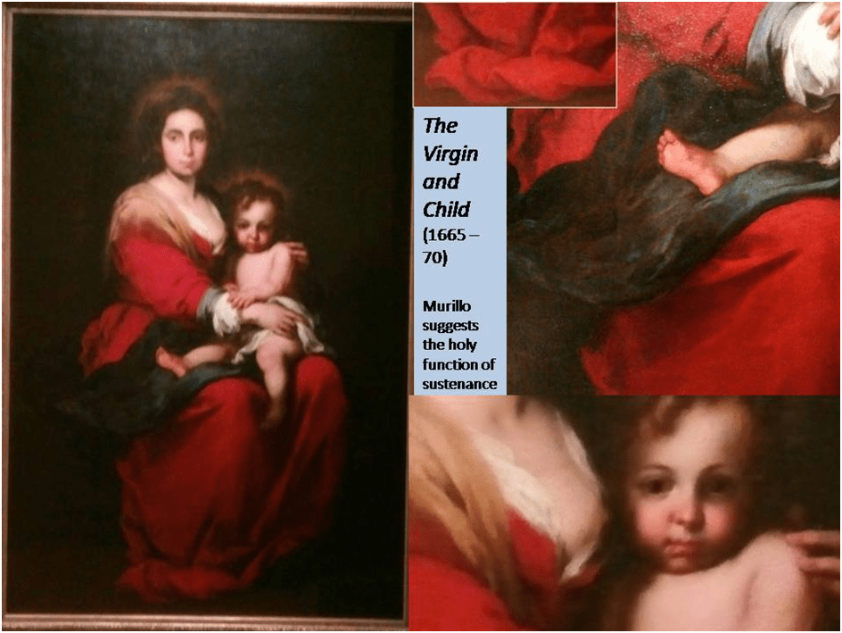 His aim is to implicate (or fold into) the story of mother and child the hungry attention of an audience keen too to share satisfaction at the good breast offered. Stoichita has shown that the popularity in Seville of the myth of the Lactation of St. Bernard, where the saint is offered suck of the breast, and indeed in some versions has a fountain of milk shot into his mouth, by the Virgin as she carries the child, who encourages the saint on to fulfilment of eloquence in her favour. Murillo himself did a version of this in about 1660 according to Stoichita but again, as Ian has said, with the breast merely expected, in the process of being squeezed before lactation, rather than given.