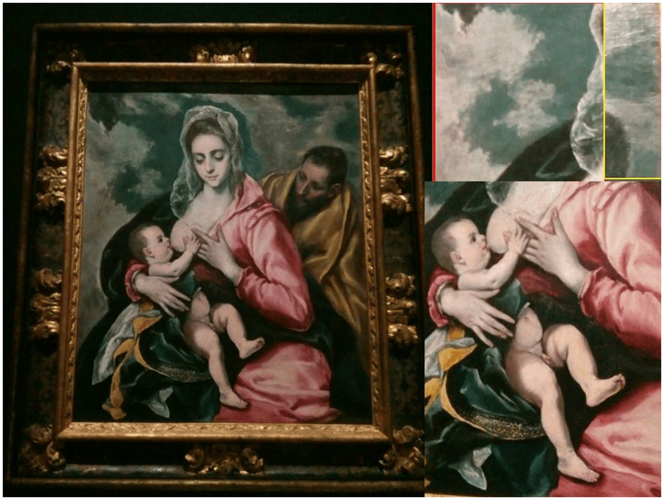 Murillo seems to have become, as a friend on Twitter has said, inclined to hide the breast of Mary from vision in the hope of its anticipation being greater than the reality (unlike, say, the very open full-breasted Virgin and Child by El Greco in my last blog (available at this link), who is literally giving satisfactory suck to her Holy Child). In contrast, Murillo aims to draw, it would seem, the viewer’s attention not primarily to the breast but to the expected satisfaction the breast will give the viewer.