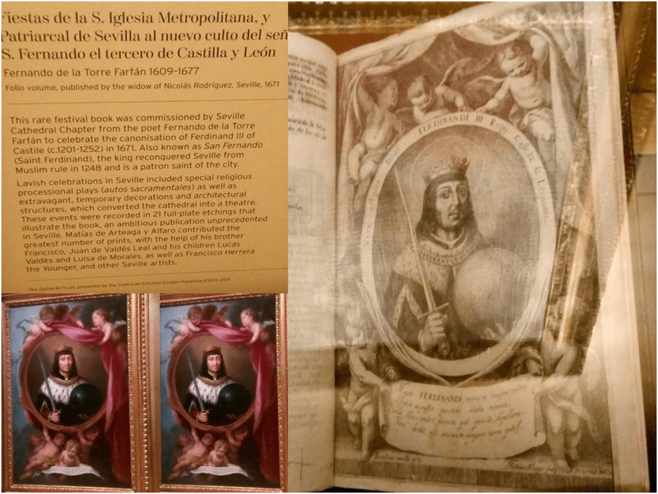 Art history it seemed once knew the painting as a lost original indicated by an etching of 1671 by Matías Artegas y Alfaro, the year of Ferdinand’s canonisation in the interests of imperial Spain, where it is entitled Ferdinand III of Spain.[9] This same etching however was produced for a book of that year commissioned from Fernando de la Torre Farfán to celebrate the festival commemorating that canonisation. The relevant page of the book is on show facing the original painting, the latter of which is shown for the very first time at the gallery. We can use the etching however to demonstrate how some very small differences made presumably by Artegas y Alfaro, change the relation of picture to viewer in much larger and, for my case, significant ways.