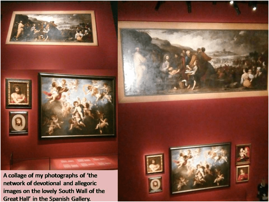 Before moving to the very excellent genre scene by Murillo which is on the first floor of the Gallery, it is worth dwelling for a moment on the digitised reproduction of the narrative of The Miracle of the Loaves and the Fishes which graces the upper part of the South Wall such that it can be seen from many vistas, including a window facing across the Hall but at one floor height in the upper gallery and a specially designed viewing balcony that also has the look of church architecture. I had to reflect here again on The Guardian review of the opening of the Gallery by Jonathan Jones (the link is to my blog on this). Therein Jones sweepingly generalises a condemnation of the Gallery around this painting thus: