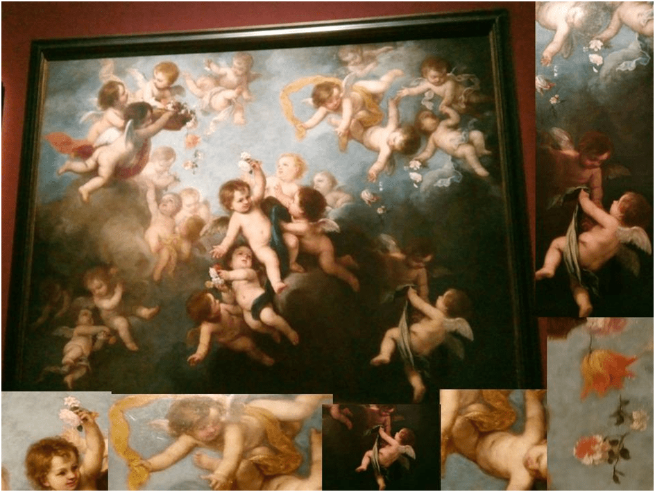 Indeed the iconography of the cherub is highly confusing in Baroque Spanish art having little in common with the concept of the cherub derived from both Judaism and Islam and still taught in the Church at the time (Milton is nearer the mark though deeply Protestant). The cherubs here are putti which the National Gallery glossary describes thus, giving a clear sense of the confusions that seems to be legitimated by their use from the Renaissance onwards: