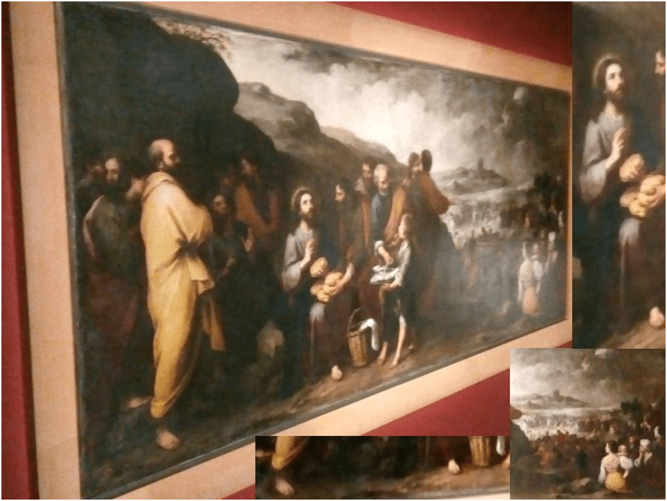 I hope I have showed already that in considering even other art by Murillo alone, especially original art, this judgement has more to do with the display of metropolitan shallowness than art criticism and helpful evaluation. Moreover, short of visiting the Church of the Hospital de la Caridad in Seville, such facsimiles serve a more than useful service, though the divorce from the idea of religious charity in which the original is embedded perhaps also forces a purely ‘aesthetic’ appreciation such as that of Jones. Diego Angulo In᷉iguez points out that this painting is a companion to an equally large painting in the same original setting for Christian charity Moses Striking the Rock and that together. Moses strikes the rock on God’s instruction; ‘so shalt give the congregation and their beasts drink’.[18] Together with The Miracle of the Loaves and Fishes they represent Christian charity in full or as In᷉iguez says: ‘Beneath the cupola’ (of the Church) ‘were placed two enormous paintings representing the giving of drink to the thirsty and food to the hungry’.[19]