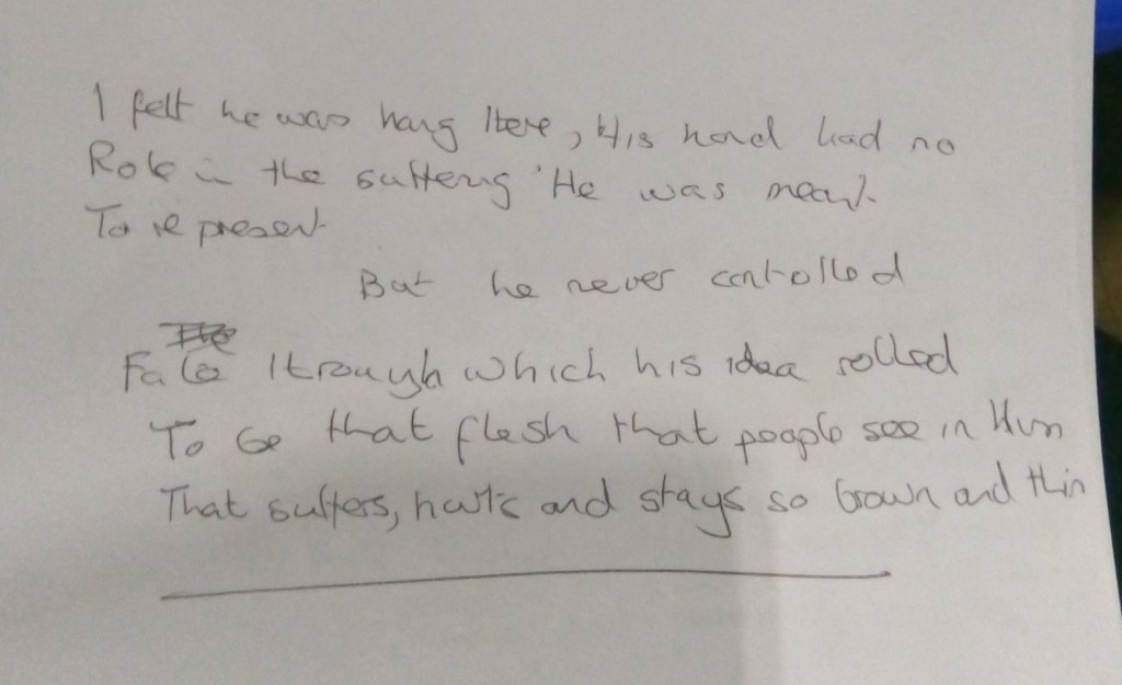 It was also clear no-one would be in the least interested in the product of the work that the lead member of the group, a staff manager, photographed them. I managed only to photograph two others (shown above). Used to isolated work I tried to write my contribution as an interpretation in some kind of blank pentameters – but with some broken half-rhymes. For me, Sargent denudes the idea of the suffering Christ whilst turning it into a collected example of merely fine but raw art to be found in unexpected places. Here’s ‘me’ poem (slightly revised since so I give the ‘manuscript’ below).