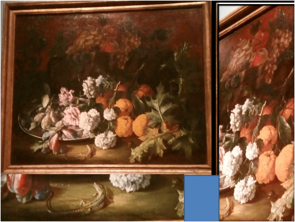 Perhaps the best illustration of later (and even more Italianate) still life paintings are those two remaining ones in the Gallery. The last we see is by Andrea Belvedere (1652 – 1732) and even more fits Johnson and Cherry’s fine description of Arellano’s work earlier, wherein time and motion are celebrated but decay seen as inevitable. They say the earlier painter has a ‘sense of movement, originating not from any external force but from the ebbing life of the flowers themselves’ which ‘convey a generous and suggestive image of nature’.[17] Though Belvedere is more hackneyed in manner than Arellano perhaps, he also wants to convey the sense of both copious bounty and constant motion This is why I think he includes that charming flexible-bodied gecko in the painting and those diagonals betokening the downward potential movement of heavy flower heads.
