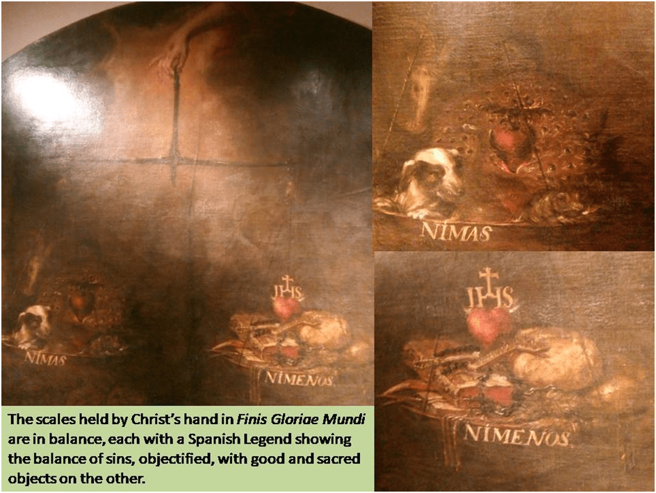 … depicts, in gruesome detail, the rotting, maggot-infested corpses of a bishop and a knight. Above is the hand of Christ holding a pair of scales: nothing more (ni mas) than the seven deadly sins signified by the animals in one scale – is required for perdition, whereas noticing less (ni menos) than prayer and repentance – symbolised by instruments of penance and devotion piled up in the other scale – is needed for salvation.[10]