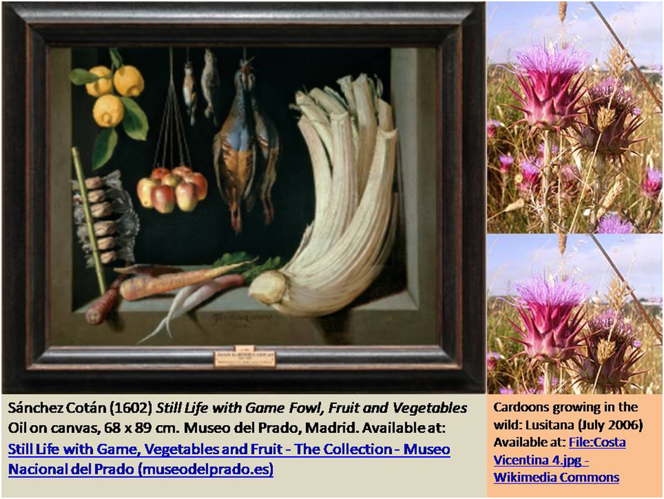 I find that prose a fascinating play upon the contradictions in responding to these works by the master and his contemporary followers. For, representations of a primitive larder or not, the paintings eradicate any chance of having detailed perspective on the framing object by placing it in a space that presents an empty and non-perspectival black darkness at its rear. This may create an illusion of ‘real space’ (and of a real cantarero) but it also reminds us that our perception is illusory, however solid seem its elements. Even the manner in which the framing space stands in relation to the actual frame of the two-dimensional picture adds to this sense of artful illusion of which Sánchez Cotán requires the viewer to take notice, as in this famous and beautiful example from 1602, Still Life with Game Fowl, Fruit and Vegetables. This latter picture by the way contains an representation of a cardoon (a decidedly ‘peasant’ foodstuff picked in the wild) with which this painter was strongly associated.