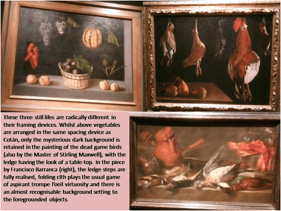 The Spanish Gallery has one work, attributed to the shadowy Master of Stirling-Maxwell, that follows this pattern with a use of the framing space as comprehensive as one of Cotán’s. However, even minimal changes of that internal frame produce a very different kind of painting and one that is much nearer to the model that was to become a dominant one. This is shown in the second painting (of game birds) where the framing device is less comprehensive and may represent a table with the upper surface from which the game birds hang being made less visible, if visible at all. The three still lifes are, to my mind, radically different in their framing devices. The second (top right) example retains only the mysterious dark background (even though it may also be by the Master of Stirling Maxwell), with the ledge having the look of a table-top. In the piece by Francisco Barranco (bottom right), the ledge steps are fully realised. A cloth falling into folds plays the usual game of aspirant trompe l’oeil virtuosity of Baroque art and there is an almost recognisably ‘real’ background setting to the foregrounded objects.