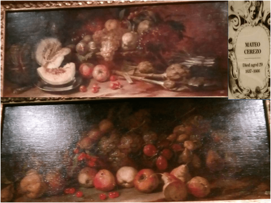 This complex and convoluted emergence of a genre in art, that referenced social themes originally, means that, when we turn to the relatively independent nature of Spanish culture in the Baroque period, there are still multiple kinds of ‘still life’ common in Spanish painting. These include those I have pointed to in past blogs – one on Murillo, for instance (the link here connects to that blog), wherein flowers cast by a host of cherubs serves a symbolic function in terms of ideas of love, charity and the passage of time. However, in what follows I will confine myself largely to those independent still lifes, except where the literature guides me otherwise. In the case of frescoes dedicated to the themes of Vanitas by Valdés Leal, the literatures does so because certain strands of a secularised vanitas theme survive in still life that do not necessarily reference religious meaning or codes but which derive from the religious tradition. So, although I will confine myself to examples from the Gallery that can be categorised as ‘independent still lifes’ (independent that is of other obvious genres of painting), we will start with examining Valdés Leal’s Finis Gloriae Mundi (The End of Worldly Glory) as this is a painting – found as a facsimile in the Spanish Gallery – investigated by Jordan and Cherry in their fine book of 1995 on the subject (there is a copy in the public reading room of the Gallery) of Spanish varieties of still life. The independent still lifes are however dispersed across three floors of the Gallery. We see the determinedly Spanish variations of the genre on the ground floor and a series of four still lifes by Mateo Cerezo (who died young in a way appropriate to the feel of death in his still-life paintings) on the first floor. There is a late Italianate example on the third floor (by Belvedere).
