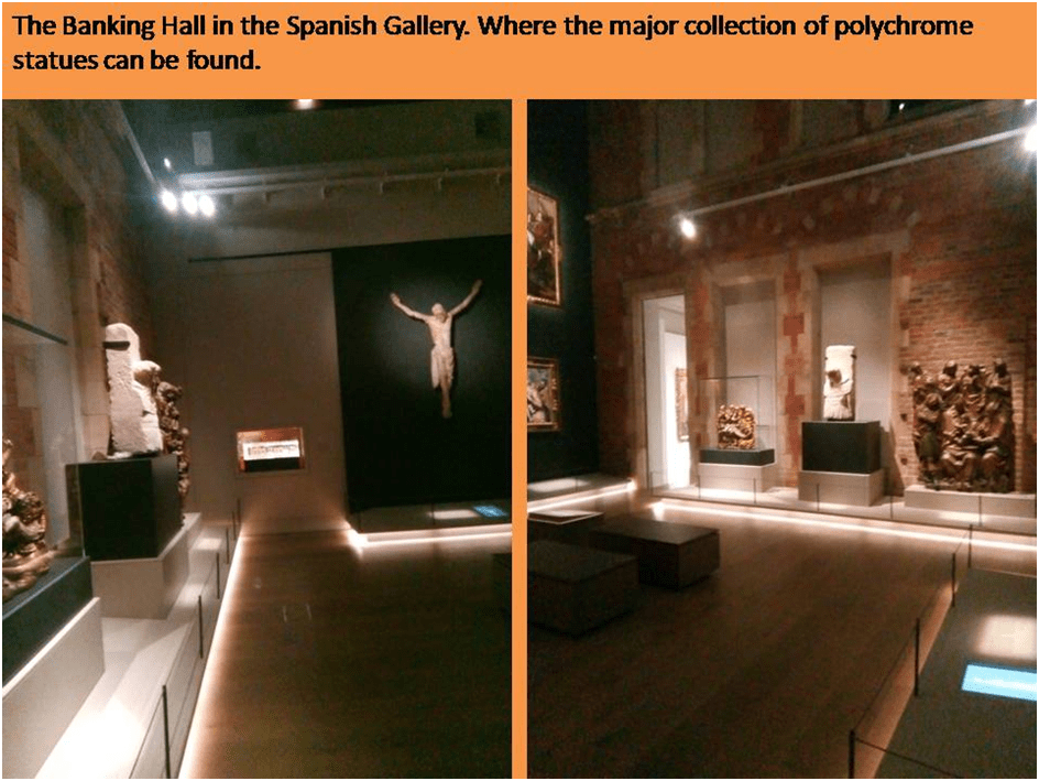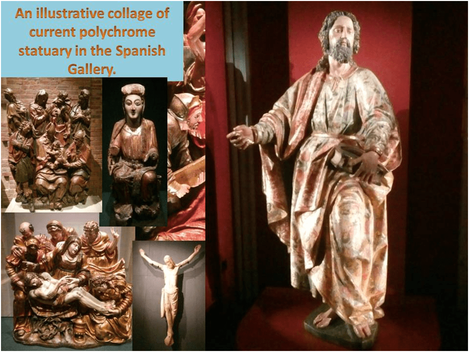 This blog examines examples of polychrome sculpture inside the Spanish Gallery that span a huge history and range of variation. It is not therefore implied that when talking about polychrome sculpture we are identifying one genre of art or even one medium of expression. The tradition of painting sculpture in sumptuous multiple colours is itself a changing one and we will not see the same features in even late medieval polychrome sculpture as in those of the Golden Age and later. It is best therefore to be armed against generalisations about the methods and practices involved in polychrome sculpture making, even its collaborative nature, for even the range of collaborative practice (of which we will become aware as we proceed) varies not only historically but within the career of any one artist. This will be stressed for instance in speaking especially of Alonso Berruguete, whose practices in this respect were open to many contingencies based on the wishes of types of patron or commission as well as the cultural opportunities local even to the geographical domains in which he worked as well as training. Yet it is difficult to see this when, as in his case, we can know his work only through two very different pieces (one in facsimile).