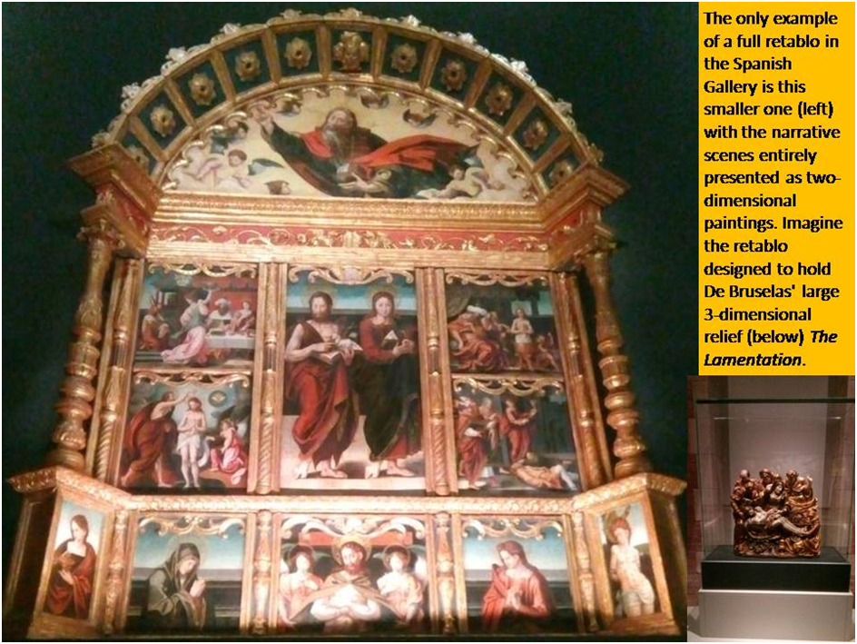 Another problem is considering what unit is covered by the term ‘work of art’. As we shall see much of the art we see in the Spanish Gallery can be considered as a fragment of what could be considered as mere parts of original whole works now fragmented and dispersed. For many of them derive from hugely ambitious functional works from the interior architecture of symbolic church decoration that were part of its liturgy and ritual. For instance, retablo mayor or high altarpieces are of major importance in Castile and the Spanish dependencies in South America. Even in Spain these have fallen prey to contingent destruction (especially in the Spanish Civil War) and change of fashion in religious architecture and decor. These ‘multi-storied’ works contain tableaux narratives within an overarching architectural and organisational framework, yet in the Spanish Gallery we shall see only single tableaux except for one retablo (a small one) containing painted scenes only rather than relief sculptural features or housing free-standing sculptures, both possible alternatives.