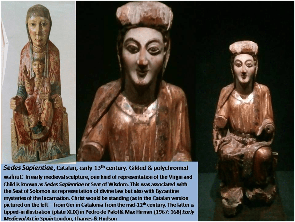 Such art is often described, by Palol and Hirmer in 1967 for instance (describing the figure on the left in the collage below), as hieratic to describe both its sacerdotal and artistically highly stylised character. The latter authors’ example of a Sedes Sapientiae is in fact considerably less stylised than that one in the Spanish Gallery on the right (indeed their example has some of the more realistic features of later Gothic art).