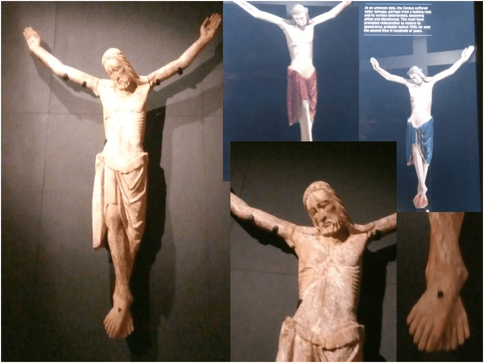 The body is in tune with ideas that are at once, in both pieces of art, ‘solemn, majestic, and hieratic’ where any story they might tell is ‘subordinated’ to ideas expressed simply. The splayed feet of the Corpus do not resemble real feet and the expression on Christ’s face look down in priestly alliance with the church congregation rather than recreate the scene at Golgotha. Mary is the Church – monumental not, in the end, a real woman and mother. Colour would have been used in conformity with these ideas – of the sacral, regal, and other priestly associations. We are a long way from the bruised and veined bodies recreated in later art, although El Greco returned to some of the stylisations we shall see here, although far from in simple reproduction.[6]