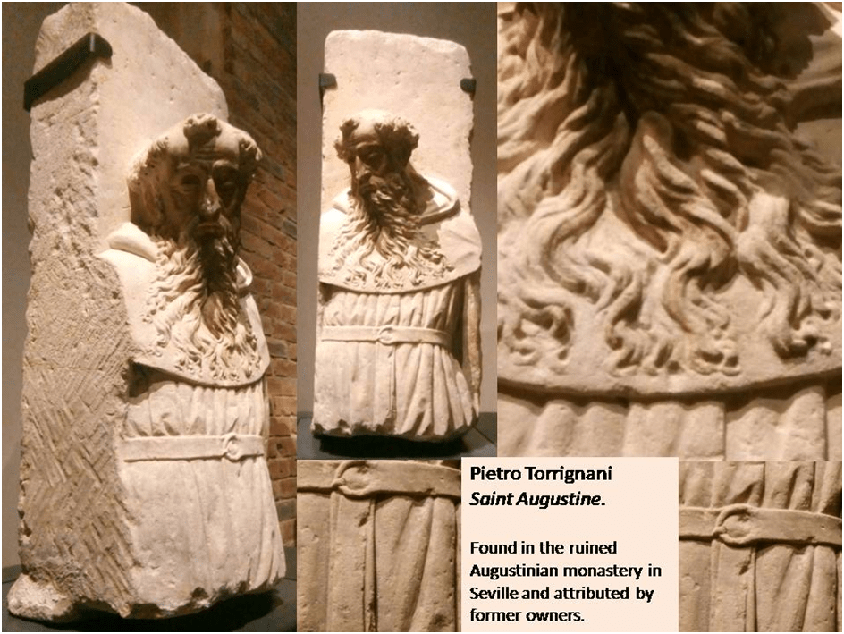 I will start with Torrigiani’s stone Saint Augustine, where anyway the attribution is questioned and based only on the seller’s assertion. I do not find myself much moved by this piece, nor, in its present state, is it the very convincing of anything other than technical skill in the folds of the clothing pulled in very realistically (but without Baroque excess or Mannerist illusion) by a belt with an amazing buckle, and the fall of facial hair. The latter feels to me too symmetrical to be other than idealized and, because so symmetrical, lacks a sense of motion to my eyes but we know it to have been painted in colour (some colouration persists in the face) but it is less attractive to my eye than other pieces around it. It seems beautiful but conventional (even in its gesture and attitude to onlookers) and easily passed by – although I admit I may need to look at it longer.