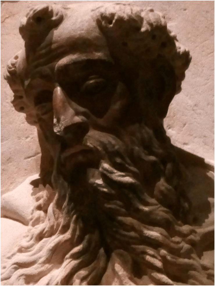 Indeed I began to try to do so as I was writing and where it seemed to begin to engage me again, as I began to study it today, is in the parts of the work in which an unworn surface remains of its face, In these places some sign of the original polychrome is visible. For when we look closely, the eyes appear to be more actively ‘seeing’, in human and empathetic terms, as they gaze down at the returning eyes of spectators (whom I presume were below the elevation of the stone relief-carving). The facial colouring would have emphasised those eyes and the orifice of the eyes may even had the capability of storing a glass prosthesis (so to speak). Look for instance at the heaviness of the eyelids and how they bear down the gaze of the saint but in a fully incarnate (indeed fleshed-out) empathy with heavy flesh bunching above them. But these thoughts are entirely speculative of course. Look for yourself at this telegraphically close-up photograph and decide: