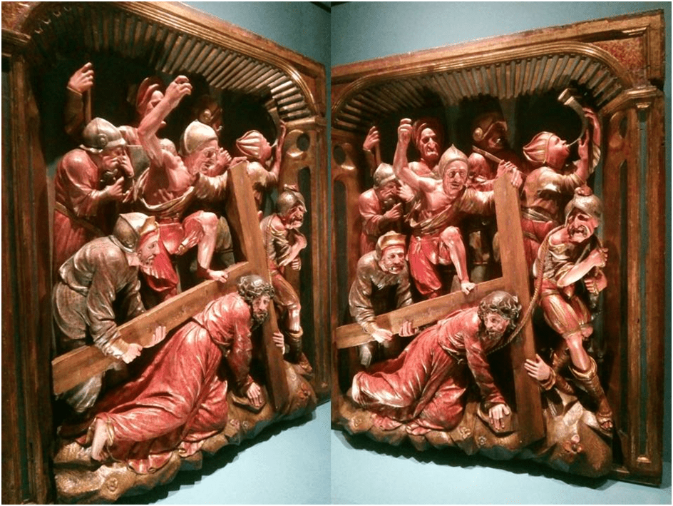 Where I begin to regain confidence is in the belief that the works by Arnao de Bruselas in the Gallery require and command every viewer’s full attention. Here the attitude is less classical than Gothic, or perhaps more accurately Hispano-Flemish (Arnao was born in Habsburg Brussels though a Spaniard). His retablo pieces, perfectly bounded in a single frame are, of course, also part of an ordered narrative on their respective retablos. They contain drama but it is not the concentrated and focused drama of the apparent ‘tableaux vivants’ of Caravaggio, which, as described by Xavier Bray, used ‘strong contrasts of light and shade … giving the faithful a sense of direct access to the scene depicted’. For these tableaux have the busy look of a much less focused popular drama, like that of a medieval mystery play, where the spectators’ gaze is, far from being concentrated, pulled in every varying directions as the eye saccades across its colourful surfaces and the relief of its three-dimensional space. Let’s start with the one considered more ‘typical’ by Ruffer, the scene of Christ stumbling on The Road to Calvary as he bears the burden of the Cross.