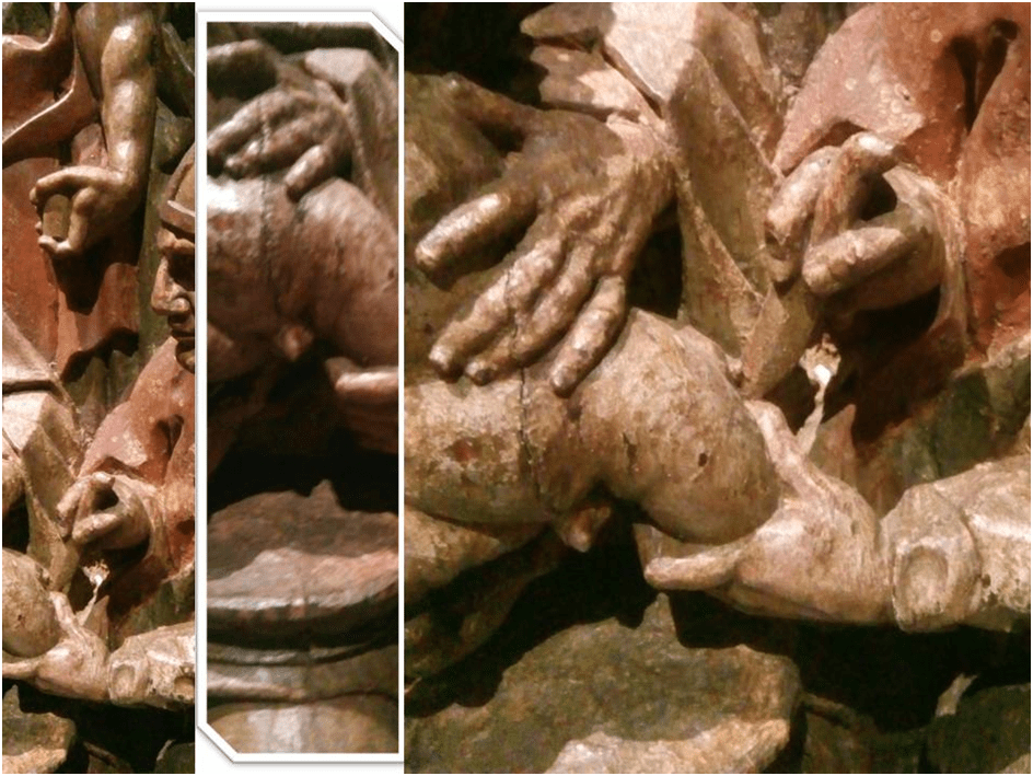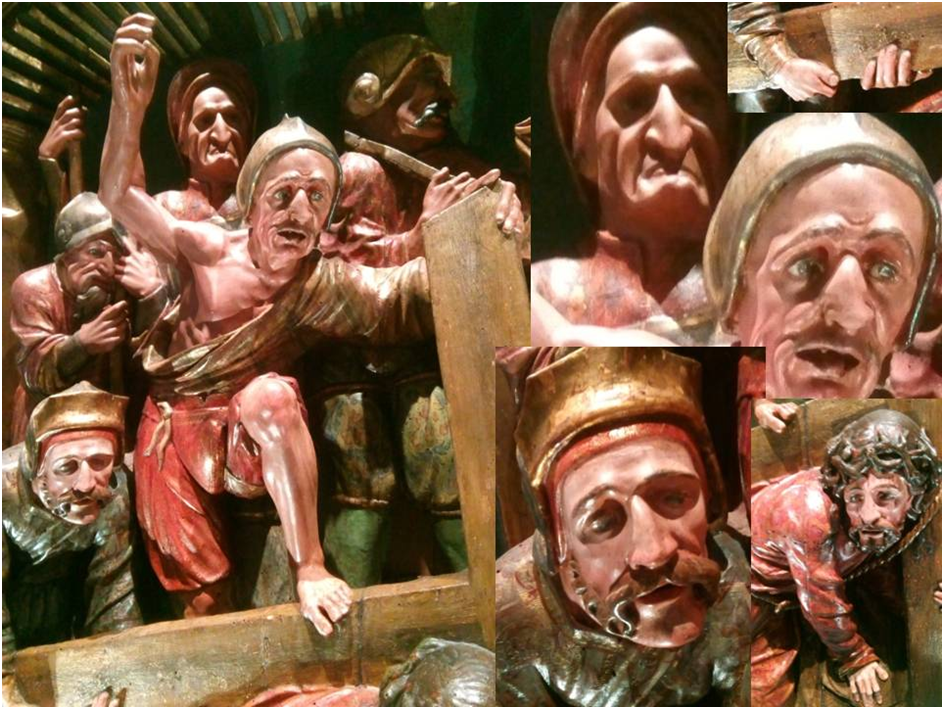 But as we look more closely details catch the eye as those eyes saccade over its surfaces and cavities. This process creates multiple levels and foci of interest just as might happen in watching a medieval mystery play where ‘bit parts’ (and representations of common people) often steal a scene. For as moving as the main drama is between the cruelty of the Roman soldiers and the induced compassion for the suffering of Christ in Simon, we cannot but notice that the cruellest of the soldiers – who presses his foot on the cross to make it harder to lift – is drawn with character in a way that allows us to see him more in the round. For instance his nose is clearly carved to show it has been broken during his soldiery. If we get nearer still we see even the broken teeth in his mouth. But this character is, when we look closer redeemed from being the ultimate in cruel treatment by the stern face of the official behind him, which brings us back to the fact that weak individual humans, especially of a lowly class and status, may not have primary responsibility for evil. And there is much to be said too in this piece about varied types of masculine appearance and attitude – two of the Roman soldiers have heavily emphasised codpieces, whilst Simon is learning to love a suffering peer male in Christ for which these hard and over-sexually centred men do not show the capability.