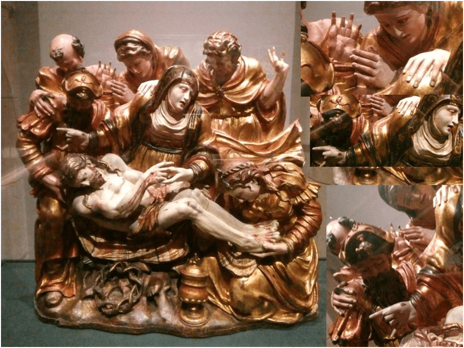 Whilst Xavier Bray must be right to insist that polychrome three-dimensional and relief sculpture was as important for promoting the life-like dimensionality of painting by Zurbarán and Ribera as Caravaggio’s well-known and well-publicised practice in Spain, he must underestimate the effect relatively on a painter of busy multi-focal scenes like El Greco (if there is anyone quite like El Greco). This is what leads me to my preference again (which I think differs from that of Jonathan Ruffer) for The Road to Calvary over the admittedly more aesthetically beautiful The Lamentation. Despite the fact that these tableaux were often inaccessible to close vision on their retablos, they clearly demand it. My first collage of The Road to Calvary relief, then, is primarily to show that the perspective and angle of vision matters enormously to how and what is seen in this work (if single work it can be called). For instance the perspective in the photograph on the left above emphasises the shape and motion of his feet as Christ collapses under the weight of the Cross but begins o be raised given the assistance, enforced assistance but here full of something like empathy and compassion (as we see in the detail in the second collage) of Simon the Cyrene. Indeed, the overall drama of this piece is dramatically conveyed by constant comparisons in the work itself of limbs and objects that either defy gravity and are raised laterally up or which fall (or are pushed) laterally downwards.