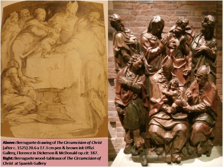 This is an appropriate point to move onto a tableau by Berruguete which is, I believe, a perfect blend of a narrative scene and devotional thought and feeling, in part through a complex iconography associated with the story of Christ’s circumcision. Such integrations seem part and parcel of Renaissance thought and in Berruguete that comes through a very careful use of innovative design (disegno) effects which balance symmetries of form of a whole tableau with inner formal tensions, thus making drama and narrative (and indeed tension between internal forms and figures) part of a whole aesthetic effect. Yet I have to admit that personally I had to view the piece many times before its absolute mastery was clear to me or its debt to the art of Michelangelo. Sometimes good critical commentary can begin to describe these effects more precisely. Thus Manuel Arias Martínez comments about the art of the retablo tableaux in very appropriate ways for my purposes by showing how the artist displaces interest in narrative drama with tensions internal to an artwork that is, though he does not state this here, maintaining a taut wholeness of symmetrical form nevertheless. He says that, ‘If Berruguete’s were interested in achieving perfect narrative legibility’ he’ would place his figures with that purpose in mind but that instead his work aims for and successfully conveys ‘pitched emotions of the moment thro’ a figural style that, in its emphasis on asymmetry & instability, evoked its own kind of tension’.[8] Here I notice that perfect descriptive moment in Martínez’s prose. He describes a kind of aesthetic tension where both asymmetry and instability in the interplay of the work’s interior parts against a stable and symmetrical containing framework. I can try to illustrate that by comparing two realisations of the Circumcision narrative by Berruguete – one from a drawing which began to imagine the dramatic moment of the Christ Child’s flesh being cut and the reaction of various onlookers and agents and his finished piece in the Spanish Gallery.