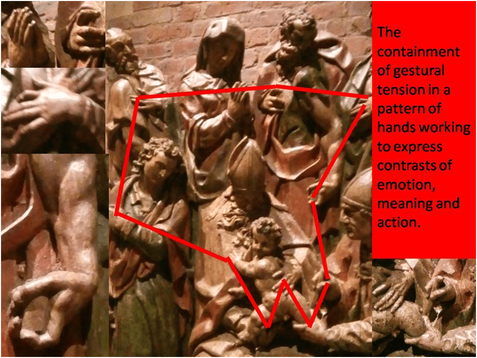 In the drawing the characters of the drama are placed around an altar but the drama is focused on the central figures around the event of the Circumcision – the officiating priests and the earthly parents of the divine child, with various spectators at a distance. Narrative scenic drama thus predominates, whilst in the wooden tableaux there is much more organisation of the characters into a visual form that contains the drama in one unit rather than dispersing it against a wider use of deep space. So that even the sharing of a square space is a cause of differentiation between these two different expressions of one event with the same figures. Of course within the sculpture there is tension but the tension is more a matter of emotion intuited from contrasting gesture and bodily attitude. I see gestural tension, expressive of extreme contrasts of emotion, meaning and action in the pattern of hands across the whole piece as both physically and emotionally contained within one overall form which is the work itself, as I try to show in the figure below.