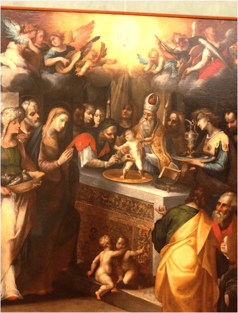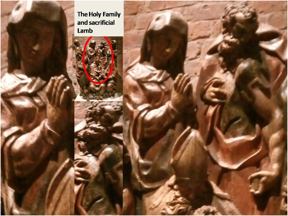 This is not I think just a matter of the fact that the medium must flatten out the representation of the characters in one rather narrow piece of wood material but of placing emotion in a framework that makes the art devotional in a way that overrides its narrative drama. And in doing so the resistance to the violence of the scene, as the child is forcibly contained in ecclesiastical hands for his flesh to be cut is less in the sculpture than in the drawing but is there as you may see, even in the emphasised strength and force of the hands that suppress the child’s fearful resistance. This is mirrored in the fact that Joseph appears to bear, as well perhaps as tools of his craft as a carver himself a lamb for sacrifice, although this feature may be somewhat lost. The lamb is placed in direct line (our eyes are guided by Joseph’s muscular arm) above the Christ child. Both are somewhat similarly powerfully (violently?) held, with a tender nuance of course in the High Priest, at least, if not his assistant, held before the knife. But if we look again at this central detail of the circumcision as an interaction between bodies, we will see that the sacrificial lamb and knife held by Joseph are mirrored by other elements of the scene’s iconography. In effect, the purpose of the iconography is to sacralise the devotional aspects of the piece. For the Christ’s child’s small penis hangs over a well carved paten – a plate-like implement used to carry the host in Catholic Christian Churches.