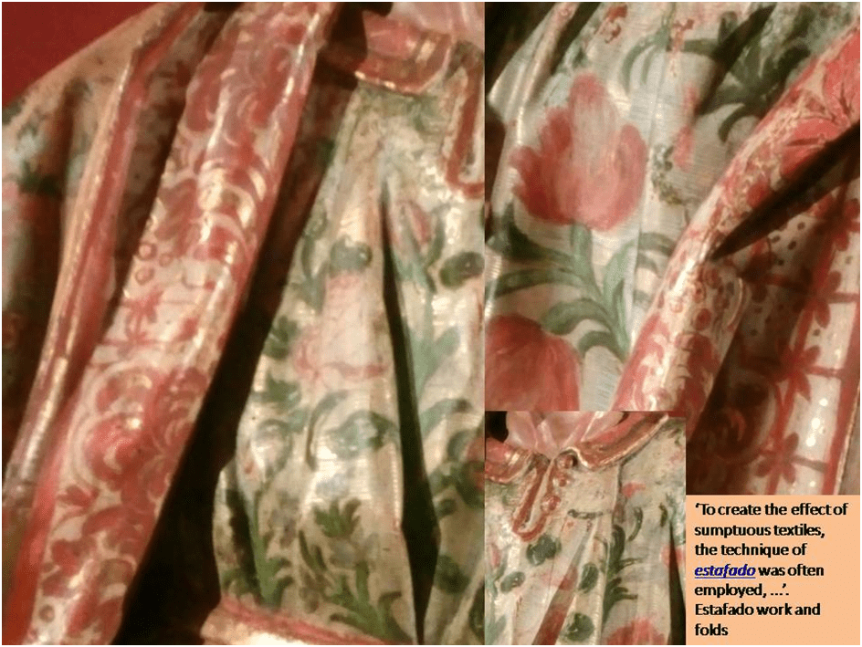 The reason for this is based in dictates of the Church that created a new kind of art that of carving the complex folds of vestments, especially highly ornamented vestments. The reason for this is that the church, and Pacheco, insisted on the clothing of figures to be carved to discourage the practice of dressing figures in real clothing ‘not in keeping with the modesty’ of Virgin saints. According to Syson this has a double effect. First it lowered the collaborative input into image-making, considered dangerously idolatrous, of an uneducated and naive (by the standards of educated churchmen and artists) laity. Second it gave artists more control and direction in the crafting of sculpture and its seamless union with a polychrome surface following every fold and undulation of carved clothing.[14] It is in the sumptuous integration of decoration with the illusion of its flow across folded and gathered cloth that artists like de Gaviria makes their extreme skill known. Indeed Daphne Barbour and Judy Ozone tell us that this technique had its own name to contrast with the skill used to create incarnated flesh tones: ‘To create the effect of sumptuous textiles, the technique of estafado was often employed …’[15] Art of a specialised kind may well begin in this process to take precedence over the religious and devotional function of the image but decide for yourself whether the saint or art most interests the artist in the following collage (though the question itself needs a more nuanced application I admit):