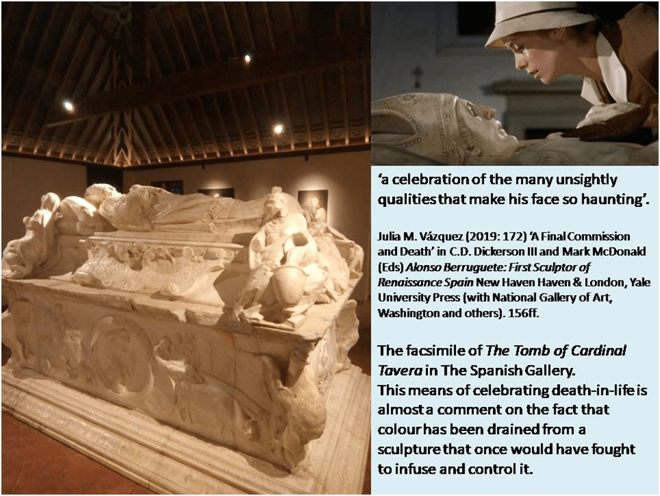 When we see a Berruguete again in the Gallery it will be a facsimile of the heavy marble Tomb of Cardinal Tavera. It is difficult for us to read this piece without seeing the monochrome state of it as a comment on what we suppose to be Tavera’s own apparent emotional coldness and love of power, as if, as it were, the sculpture was polychrome but with its colour drained in order to make a point about what it means to live or not to live. Bun͂uel seemed to emphasise this in his film Tristana (1970) when Catherine Deneuve climbs onto his body and gazes in its half-open dying eyes as if sexually drawn by the horror she sees – sunken cheeks and heavy dying eyes.