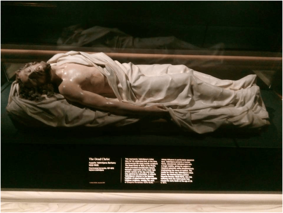 However, like everyone else, one leaves the Main Banking Hall of the Spanish Gallery without expectation that there is more in this so-far surfeit of polychrome art. But at the exit is the only example of seventeenth-century Baroque polychrome sculpture, the time of its greatest expansion as an art independent of traditions in other parts of Europe at the time. Internationally one name dominates this period, that of Pedro de Mena y Medrano. And whilst there is a beginning literature on the latter, you are hard pressed to find material on another Master of Granada origin, Bernabé de Gaviria (1577 – 1622). The Saint Bartholomew in the Spanish Gallery surely bears comparison to de Mena, though de Mena’s preference for figures in their early youth makes such comparison difficult (certainly not worth trying here).