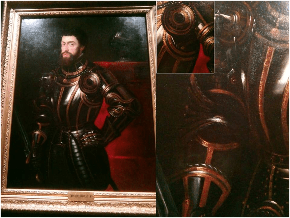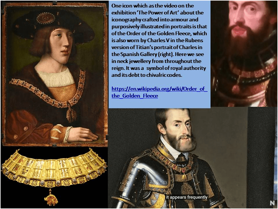 As in all portraits of Charles and later Hapsburgs he is adorned with the emblem of the Order of the Golden Fleece hanging from his neck. The symbol is perhaps more clearly seen in better photographs of portraits from throughout the reign where in each a version of this neck jewellery. It was a symbol of royal authority attributing its origin to both classical and medieval origins: aristocratic, dynastic (because derived from the knightly and Greek aristocratic connection to horses), courtly and chivalric codes and values. Since it partook in part of the imagery of the sacrificial lamb, it was symbolic of the union of Christ’s kingdom and chivalric duty. Of course the Hapsburgs always wore it but they wore it to convey their role as Christian Knights, a meaning of the armour it adorned.